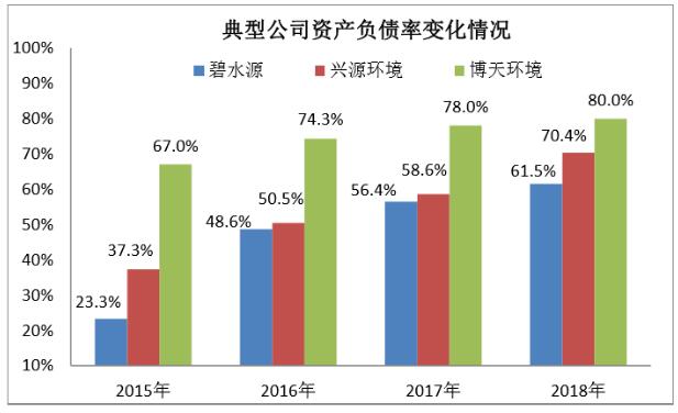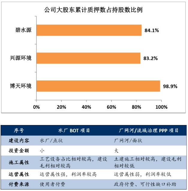 业务内容和形式的变化以及竞争者增多的情况下,项目资金需求增大、投资回报率降低、建设运营利润率下滑,缺乏比较优势的企业经营的难度和压力不断增大。利润率下滑、负债率快速提升、质押增多是民营环保上市公司参与PPP业务的结果。虽然PPP模式带来市场需求进一步爆发使得诸多环保公司有良好的业绩增长,但资金风险也不断加大并形成了较大的行业风险。