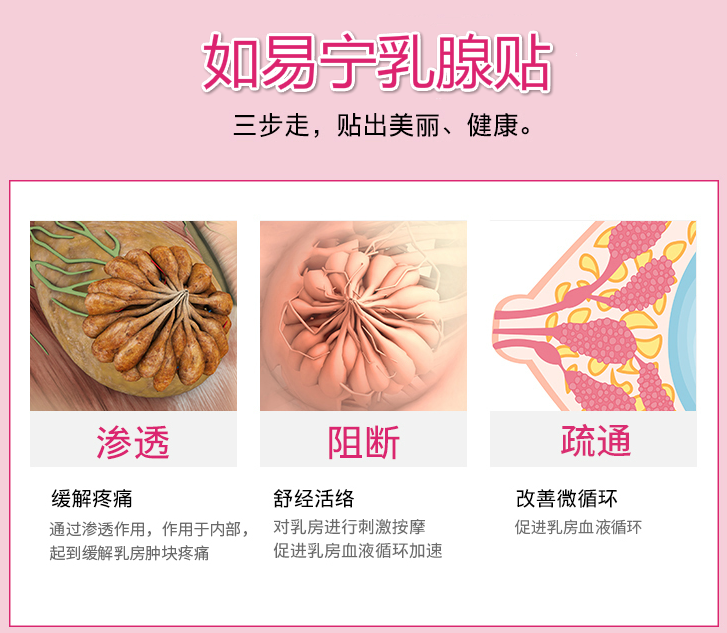 如易宁最主要的功效自然是解决女性乳腺的问题,让女性恢复健康的感觉。本贴主要就是通过对局部穴位进行贴敷,从而达到疏肝理气,活血化瘀,软坚散结,导滞消炎的作用,进而从整体上调整机体气血阴阳平衡,维持女性正常的内分泌功能,保持正常的月经疗程,从而达到疏通乳络之功,对于乳腺增生,乳腺结节等乳腺疾病有比较显著的效果。