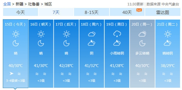 7月15日,新疆气象台发布高温黄色预警信号:预计15日至19日,新疆多地区将有35℃以上的高温天气。其中,克拉玛依市、吐鲁番市、哈密市等地的最高气温将在40℃以上。