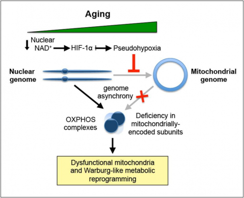 NAD+含量下降,HIF-1α积累,线粒体功能受损(衰老标志之一)