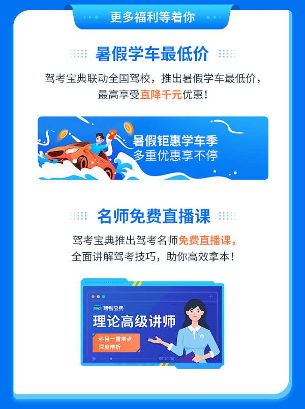 此外,通过驾考宝典APP,考生还可以了解到全国范围内海量驾校的暑期招生优惠政策。驾考宝典联动全国优质驾校,推出暑假学车最低价,最高享受直降千元的惊喜优惠!为了提高考生的学习效率,驾考宝典更是特聘专业的机动车驾驶理论知识高级讲师,开设免费直播课程,全面讲解驾考技巧,帮助同学们高效拿本!