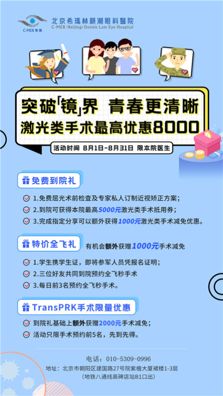 为助力暑期摘镜,北京希玛林顺潮眼科医院特推出“突破镜界 青春更清晰”摘镜优惠活动,8月1日-8月31日,激光类近视手术最高可优惠8000元,还有多重好礼等你来领取。