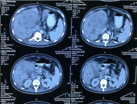 孔祥泉,男性,43岁,因皮肤发黄、肝区不适一个月,各种检查结果很不乐观。MR检查见:“S4/8肝内多发结节及团块(最大102mm*81mm),考虑肝癌合并子灶,侵犯肝门区胆管,门静脉主干及分支、肝右静脉受压、管腔变窄,肝内胆管扩张。胆囊增大并壁周水肿。肝硬化、脾大、少量腹水,食管下段、胃底及脾周静脉曲张,肝门区、门腔间隙及腹主动脉旁淋巴结(百度搜索:广州复大肿瘤医院)。
