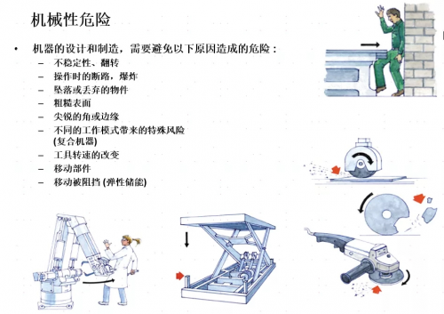 在CE-MD看来,机械性危险主要包括产品设计的不稳定性、翻转,操作时的断路、尖锐的角和边缘、不同工作模式带来的特殊风险等(详见下图)。而AMR属于机械类产品,所以必须要要符合CE-MD的机械安全要求,按照CE对机械安全的法规要求做机械安全评估。