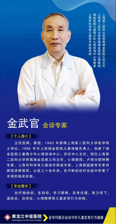 金武官主任长期从事儿科专业。专业擅长治疗抽动症、多动症、学习困难、发育迟缓、智力低下、遗尿症、自闭症、心理障碍等儿童发育行为疾病。