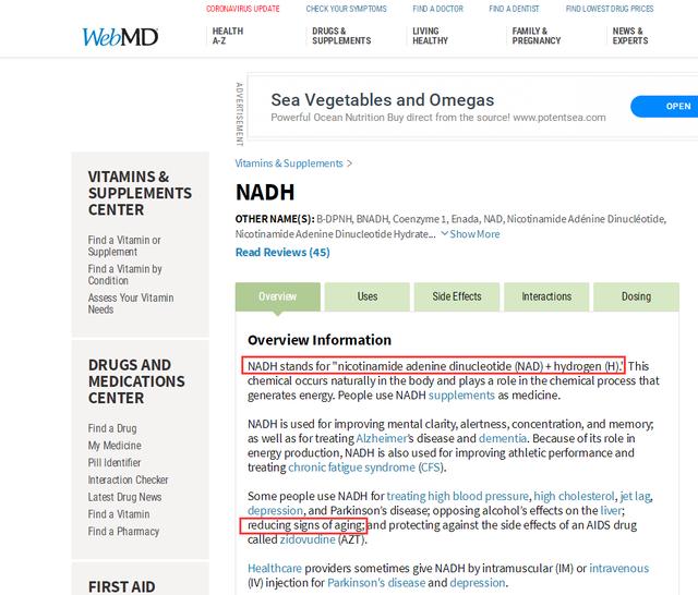 国际权威的医学健康信息平台美国WebMD网站介绍NADH延缓衰老作用
