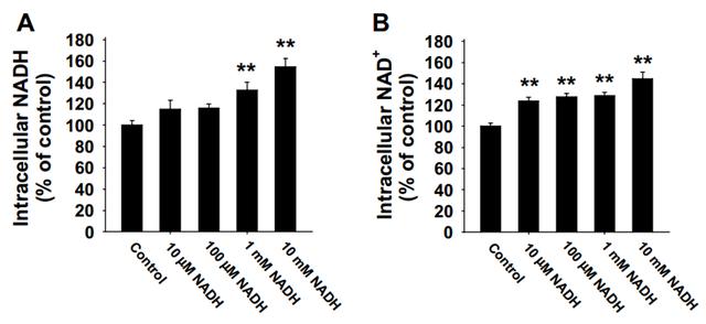 上图是通过给细胞添加NADH一小时后,细胞内NADH(A)和NAD+(B)的浓度变化。可以发现所有NADH浓度都增加了细胞内NAD+水平,但低浓度补充NADH时细胞内NADH水平变化不明显。