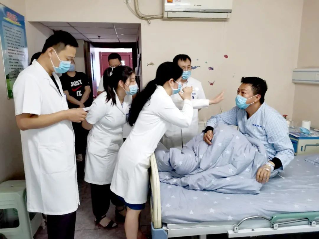 (莫爸爸手术后第一天,查房中杨教授与王教授为他做检查)