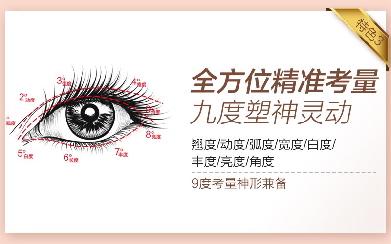 3、对眼睛的翘度、动度、弧度、宽度、白度、风度、亮度、角度,九度全方位考量,综合塑神确保自然和谐、神形兼备的效果;
