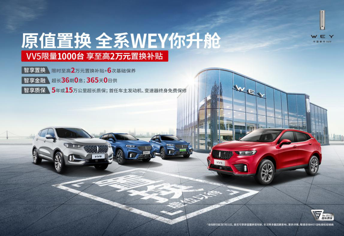 VV5不仅是自身实力能打,购车福利同样大手笔。据我了解,VV5现在延续了“原值置换,全系WEY你升舱”活动,可以用家中的旧车参与置换,如果你是长城品牌(C30),哈弗品牌(H1、H2、H4、H5、F5、M6、H6、F7)部分车型车主及WEY品牌全系车型车主,便可以获得2万置换补贴+6次基础保养,并且,根据车龄和车况表现综合考虑,有可能实现100%原值置换。