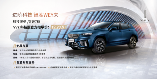 WEY VV7 科技版不仅让年轻精英拥有了同级唯一智能科技座舱,更为他们展示出WEY品牌的强大科技实力和对用户的极大诚意。VV7科技版售价19.28万元,购车即享基础保养终生免费、智控三视远程查看服务3年免费、双超质保三重专属礼遇。可以预计,随着WEY VV7 科技版走进更多年轻精英的生活,WEY品牌向上突围、向外突破的步伐也将越来越快、越走越稳。