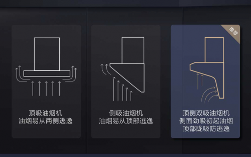 侧吸式抽油烟机会将风口设计下移、偏向于油烟发生的根源区域,能快速吸除升腾油烟,但爆炒时产生的大油烟容易从两侧逃逸;