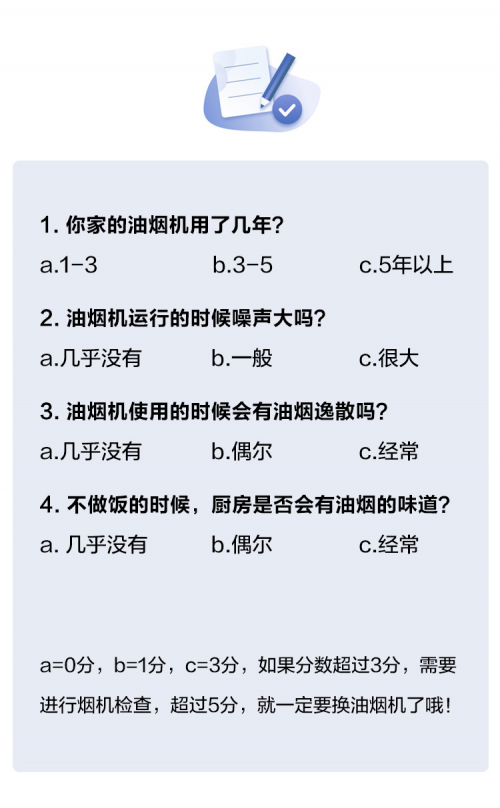 如果还是不确定是否应该替换油烟机,不妨试试下面的小调查,简单的4道题,直观的告诉你你家的油烟机是否需要更换了~