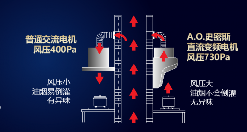 风压越大,排烟力量越大,在传统中式爆炒所产生的瞬间油烟量下,普通烟机的400pa风压值很容易出现油烟逸散的问题。