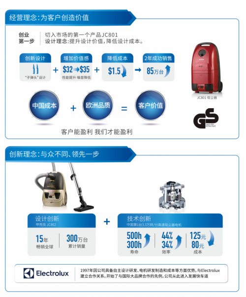 凭借卓越的工业设计才能,由倪祖根先生亲自操刀的第一款吸尘器——JC801, 上市两年就销售了85万台,销售额2.5亿人民币,为创业成功打下了良好基础。创业第二年即96年,销售吸尘器68万台,一举夺得吸尘器产销量全国第一。而随后设计了JC862甲壳虫吸尘器。以其独特造型成为莱克历史上销售最成功的一款吸尘器,连续畅销15年,累计销量300万台。