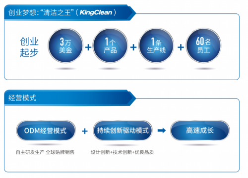1994年底,由工程师出身的倪祖根先生从苏州春花吸尘器总厂辞职,创办了苏州金莱克电器有限公司,并将公司英文名命名为“Kingclean”,立志成为全球“清洁之王”。聚焦吸尘器,先做大,后做强,从60名员工,一个吸尘器产品,一条生产线,开始了以吸尘器ODM经营模式和持续创新的驱动模式,开启高速成长之路。