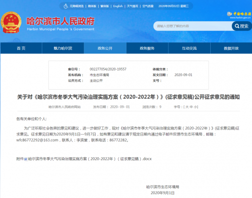 近日,哈尔滨市生态环境局发布关于对《哈尔滨市冬季大气污染治理实施方案(2020-2022年)》(征求意见稿)公开征求意见的通知,其中征求意见稿以治理农村、城中村、棚户区燃煤污染,热源建设及老旧小区改造,治理燃煤锅炉污染,开展冬季大气污染专项治理及亚布力景区冬季大气污染治理为重点任务,使用电、气等清洁能源改造替代散煤。