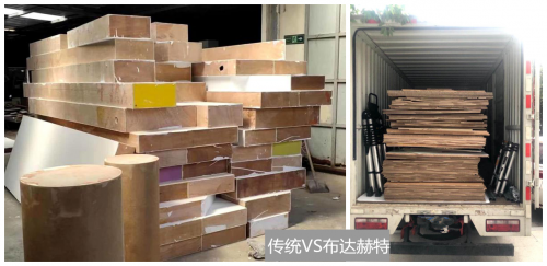 “现在人工费用很高, 一位木工师傅一天至少500元的工钱,一个展览公司木工人数有几十或上百,所有木工师傅的工资都是从制作费里赚取,这使得办展企业成本飙升。”杭州熊熊环保科技相关负责人说,“而布达赫特制作的产品,在车床上就完成了切割,可以整张发出, 现场可以如同乐高和LABO-样, 从纸板上掏出组装,省时省力。”