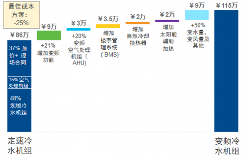 对比定速冷水机组与变频冷水机组,变频冷水机组在初投资阶段需要相对较高的投入。不过根据科学估算,一旦应用集成楼宇管理系统、电子控制和变频技术的涡旋冷水机组之后,全年能效直线提升,后期运营过程中的年度能效成本也大大降低。同时,在各国开始对加剧全球温室效应的制冷剂提高税额时,变频涡旋冷水机组的应用也将有进一步的上升空间。