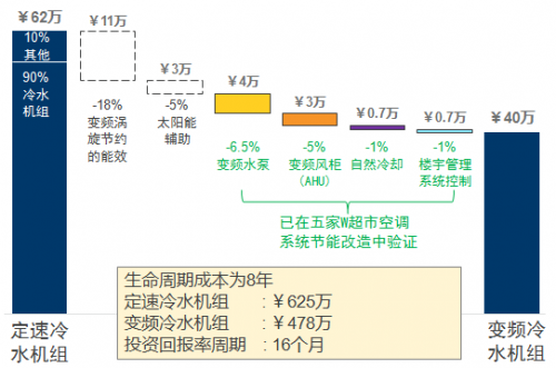 在5家W超市空调系统节能改造的项目,艾默生变频涡旋冷水机组的解决方案,帮助工商业空调系统挖掘出巨大的节能潜力。