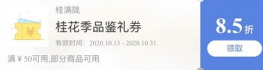金秋十月,此时前往桂满陇品宴还可到店自助领取桂花季8.5品鉴礼券,任选桂花季系列限定菜品中的一款使用,具体使用规则以门店实际为准。