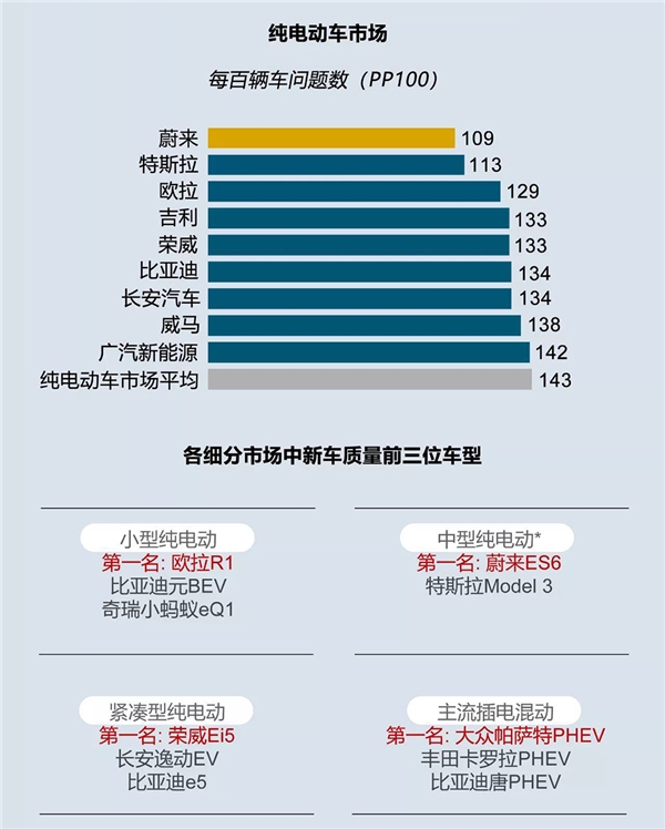 更值得一提的是,在不久前权威统计机构J.D.Power公布的中国市场新能源车型的新车质量排行榜中,欧拉黑猫(更名前为欧拉R1)以硬核实力成为小型纯电动汽车中的王者,一举成为细分市场中新车质量TOP1。而在纯电动车市场中,欧拉黑猫也表现不俗,与30万级别的蔚来、特斯拉的故障率相比,质价双优的属性展露无遗。
