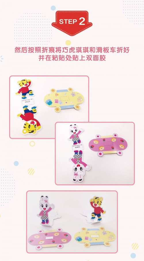 活动现场,有好多家长都跟孩子开心的做着互动。活动内容也很有趣,首先就是为巧虎琪琪分别选择不同颜色的滑板车,有黄色的还有粉色的,然后按照折痕把巧虎琪琪和滑板车都折好,并在粘贴处贴上双面胶。最后将巧虎好和琪琪分别粘贴在相应的滑板车上,整个过程简单又有趣,还能锻炼孩子的动手能力,孩子玩的超开心,还交到了一个非常可爱的朋友呢。