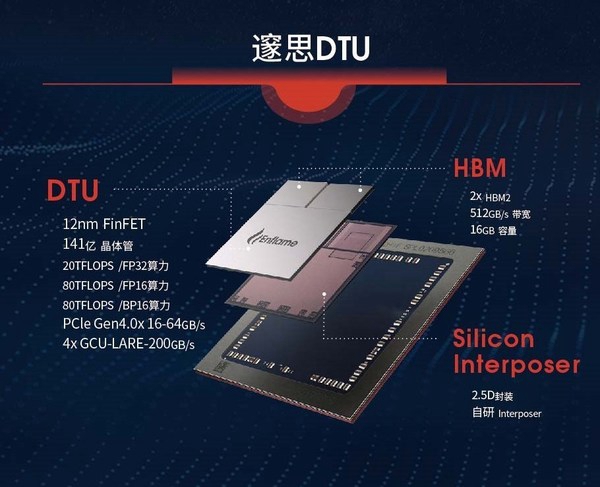 邃思(DTU,Deep Thinking Unit)是专为人工智能应用开发的算力加速处理器芯片,基于创新并具有完全自主知识产权的燧原GCU芯片架构(General Compute Unit),包括计算引擎、数据架构、智能互联和先进封装等自研核心技术。由格罗方德12nm先进工艺打造,采用2.5D立体封装,包含141亿个晶体管。该芯片针对数据中心人工智能训练场景,支持计算机视觉、语音识别、自然语言处理,机器学习知识图谱等AI模型训练,在保持高度的灵活性、可编程扩展的同时,在算力、能效比、性价比等维度上具有竞争优势。