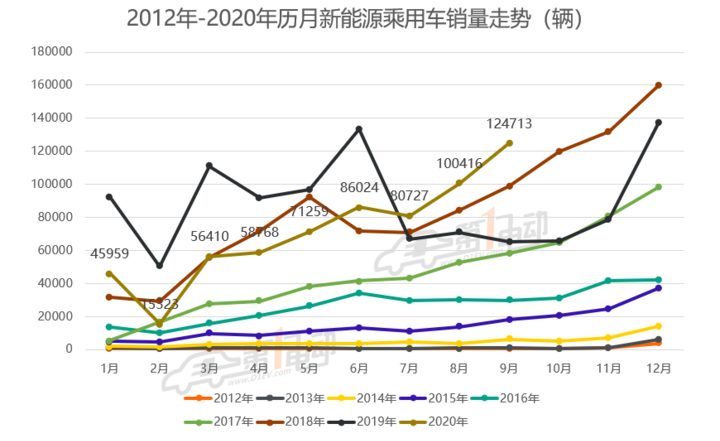 新能源汽车的市场份额却在不断攀升。根据乘联会最新数据,2020年9月新能源乘用车批发销量突破12.5万辆,同比增长91.8%,环比8月增长24%。其中插电混动销量2.2万辆,同比增长55%。纯电动的批发销量10.2万辆,同比增长102.6%。