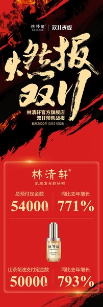 自“五五购物节”以来,林清轩在上海市商委举办的多个促销费主题营销活动契机下,依托数字化直播的方式实现业绩稳步增长。就在10月22日,国货高端护肤品牌林清轩2020天猫双11预售首日线上全天订单数6.4万单,同比去年增长920%;其中,明星产品山茶花润肤油预售订单数超过5.6万单,同比去年增长900%。