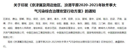 近日,生态环境部会同国家发改委等十六个部门印发了《京津冀及周边地区、汾渭平原2020-2021年秋冬季大气污染综合治理攻坚行动方案》,《方案》指出,要进一步巩固和提升过去秋冬季大气污染治理攻坚行动取得的成果,推进清洁取暖散煤替代工程。该方案的出台体现了京津冀地区在防治大气污染、治理生态环境方面的信心。