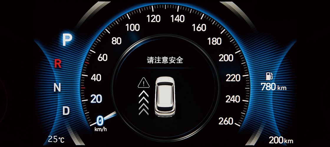 在日常使用当中,系统将通过车后方的盲点雷达监测后方来车情况。当后方车辆接近时,相应后视镜上会进行提示,且仪表盘会显示“请注意安全”的提示语,车门将自动锁闭,并发出报警。