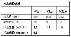 通过计时30s,对额定时长下冷、热出水量进行计量测试,再换算出热水流量,测试结果如下: