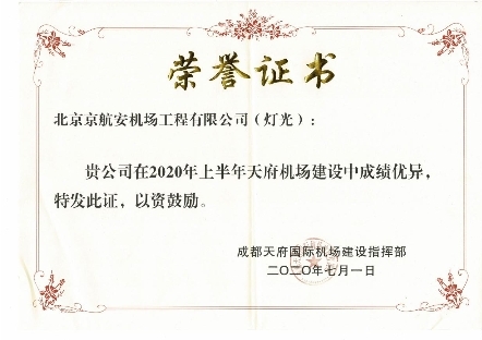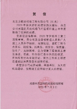 在项目施工过程中,京航安克服了工期紧、任务重、交叉施工多、疫情突袭等难题,按照施工计划保质保量追赶项目进度,收到了来自成都天府国际机场建设指挥部的颁发的荣誉证书与贺信。