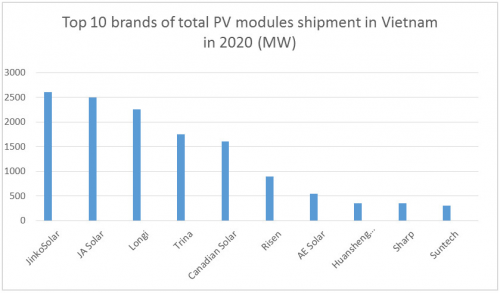 越南MOIT与Clean Energy Associate官方媒体Vietnam Energy Online近日发布2020年越南组件出货量市场报告,数据统计显示,晶科能源以超过2.5GW的销量,连续第三年稳居越南市占第一。晶澳,隆基分列第二、第三,阿特斯,东方日升,新源,东方环晟,夏普,尚德紧随其后。