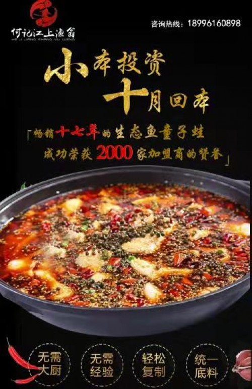 何记江上渔翁美蛙鱼头火锅人气好,口碑好,期待与您携手。该品牌的火锅美食产品辣而不燥,久吃不上火,放开嘴巴尽情品尝。特色美蛙鱼头加盟选择何记江上渔翁美蛙鱼头火锅就是很好的,这个品牌的经营十分灵活,加盟其中可以得到很好的回报。