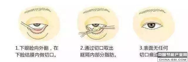 在眼皮内侧的粘膜面,切开1~3mm的刀口,通过刀口取出多余脂肪,对合粘膜刀口,不需要缝合。