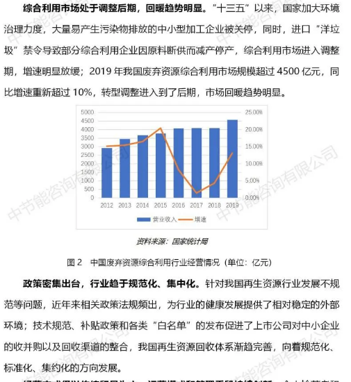 北极星固废网获悉,近日,中节能咨询有限公司发布了回收利用行业研究(简版),从行业现状、竞争格局、发展趋势和风险提示四方面入手,对再生资源行业进行了分析,详情如下: