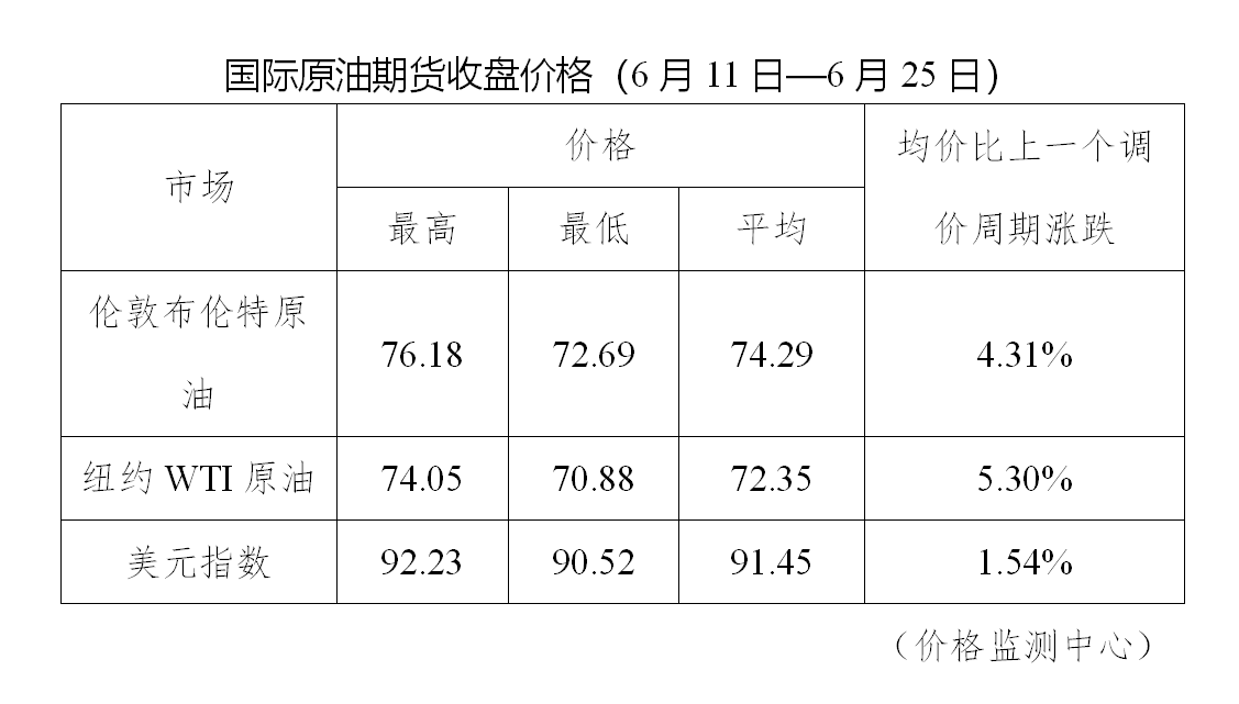 据国家发改委价格监测中心监测,本轮成品油调价周期内(6月11日—6月25日)国际油价继续上涨。平均来看,伦敦布伦特、纽约WTI油价比上轮调价周期上涨4.80%。受此影响,国内汽油、柴油零售价格随之上调。