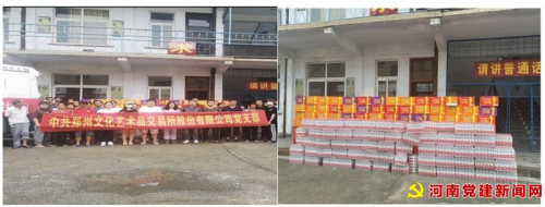 一方有难,八方支援,我们与灾区人民心连心,2021年7月20日一场特大暴雨降临在我们河南地区,到处一片汪洋,多年不遇的特大暴雨让我们的家乡人民群众受灾受难,在这危急时刻,风雨无情人有情,21号下午三点中共郑州文化交易所有限公司党支部书记董军敏同志紧急召开了公司全体党员和干部会议,会议部署了筹集资金购买当前灾区人民群众急需物资,下午五点会议结束后董军敏书记亲自带领几名党员干部前去市场购买当前灾区人民群众急需用品:矿泉水和方便面为了不挡误第二天早早出发当天晚上联系了一辆箱式中巴车把灾区急需食品装车。