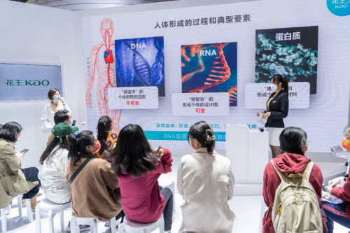 来到花王展台中央,在花王“未来生命”版块集中呈现了花王探索生命奥秘的“本质研究”成果—花王首创的从皮脂中提取RNA进行分析的“RNA监测技术”。来场观众通过介绍视频,初步了解了花王“RNA监测技术”可以通过一张吸油纸便可轻松获取RNA信息的特点和目前在“帕金森病的早期诊断”等方面的运用。此外,通过“Curél珂润”润浸保湿滋养乳霜、“Rerise芮思”天然黑发染发膏、“freeplus芙丽芳丝”洗面奶等对肌肤温和的代表产品,对于花王“RNA监测技术”的实际分析运用有了进一步的理解。