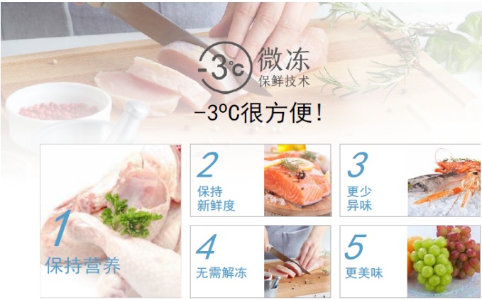 不同于零度保鲜,新品搭载的-3°C微冻保鲜仅使食物表面稍微冻结,不损伤食物细胞,解冻时基本不会有血水、汁水溢出,最大限度保留生鲜食物的营养和口感;在有效时间内,可以保证肉类食材营养不流失。同时,用户使用肉类食材时也不必解冻,提升烹饪效率。与冷藏相比,可以实现更持久的保鲜效果;与冷冻相比,则能够更好地维持美味度。