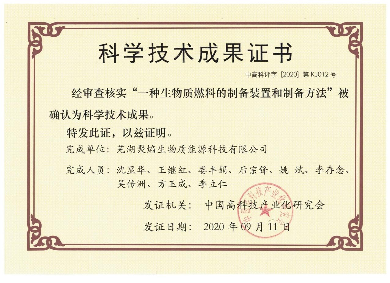 2020年9月11日,成果评价机构:由国家奖励工作办公室公示的第二批科技成果鉴定试点单位、第三方评价机构中国高科技产业化研究会组织国家级专家,农业农村部规划设计资深研究员田宜水老师担任本次科技成果评价主任。在北京主持召开由本公司完成的"一种生物质燃料的制备装置和制备方法"项目科技成果评价会。