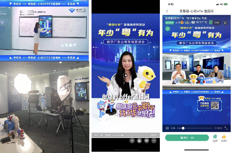 仅在11、12月期间,易展翅已陆续在暨南大学、深圳大学、深圳信息职业技术学院、长沙民政职业技术学院等知名高校内开展秋季招聘直播专场,与京东物流、数字广东、金财互联、华润集团、小鹏汽车等知名企业合作开展数十场品牌专场宣讲会,吸引全国高校学生观看投递。在最近一次与数字广东合作的专场直播中,易展翅直播间收获了51000+次观看人次,直播间获分享转发800+次,形成了良好的雇主品牌宣传效果。