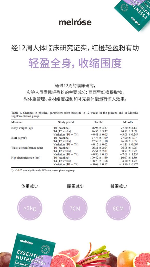 据世界领先的学术出版集团泰勒-弗朗西斯(Taylor Francis)出版的科研报告显示,在30名超重及肥胖志愿者中,进行为期12周的人体临床实验。结果显示,西西里红橙提取物,有效帮助人体体重减少超过3kg,腰围减少7cm,臀围减少6cm,证实西西里红橙提取物可以防止脂肪堆积。并且在非暴饮暴食的情况下,体重不会反弹。