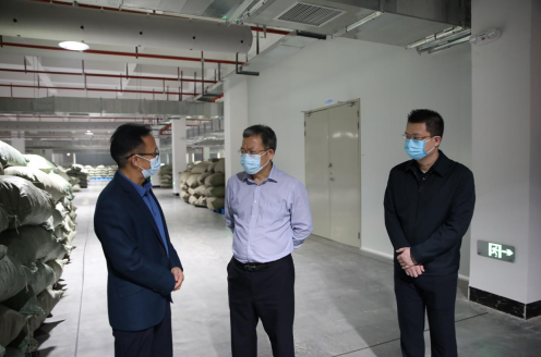 彭书记等人在考察综合仓库、提取及前处理车间