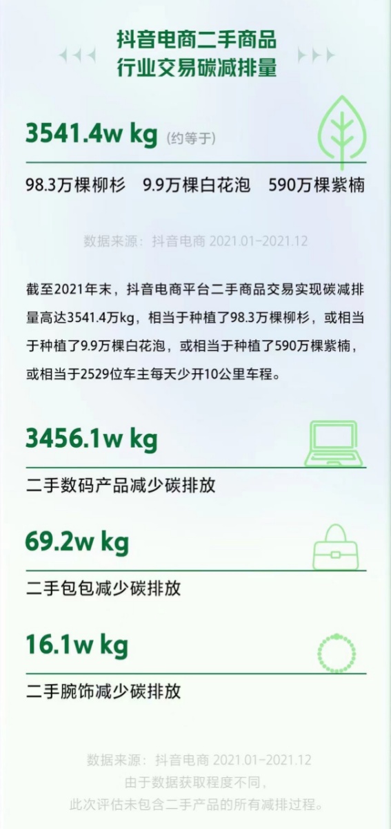 报告显示,2021年1-12月,抖音电商平台二手商品交易实现碳减排量高达3541.4万kg,相当于种植了98.3万颗柳杉,或9.9万颗白花泡,或590万颗紫楠,或相当于2529位车主每天少开10公里车程。其中,二手数码产品减少碳排放3456.1万kg,二手包包减少碳排放69.2万kg,二手腕饰减少碳排放16.1万kg。在平台、商家、专业主播、公益作者的共同努力下,抖音电商二手商品行业呈现出较强的发展潜力。