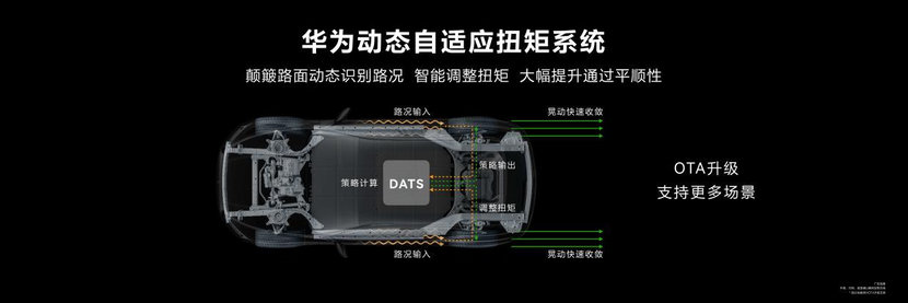 HUAWEI DATS可根据路况和车轮附着力进行动态的扭矩调教,在通过坑洼路面时轮速波动(颠簸感)稳定时间降低46%,座椅前向加速度(冲击感)下降31%,减少车辆晃动,更快速的让车身稳定下来,让车辆行驶在颠簸路面时更平顺;在通过弯道时,DATS系统动态感知入弯及出弯的路面,进行扭矩的自适应调节,提升侧向力从而降低甩尾风险,让车辆过弯更平稳。整套系统采用动力线性化设计,能够根据需要动态降低电机功率,有效提升车辆续航。