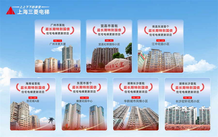 目前,上海三菱电梯正在稳步推进超长期国债项目,其中首批超长期国债项目已经覆盖了13个省,4个直辖市,1个自治区,包括广州丰景大厦、宜昌虹桥国际小区、江中花园小区、塘厦花园中心、丽花城A座、华韵城市风情小区、以及长沙宏轩花苑小区等。第二批超长期国债项目也正在如火如荼的开展中。