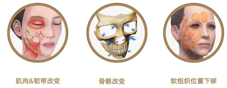 随着年龄的增大、重力的作用,韧带固定作用减弱,相应的皮肤及皮下组织就会出现移位。